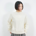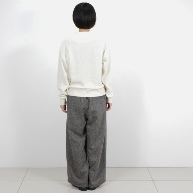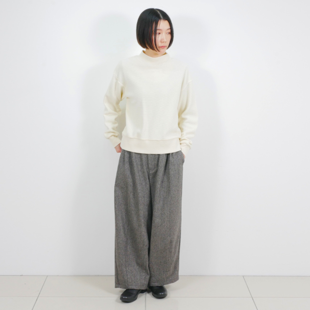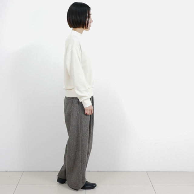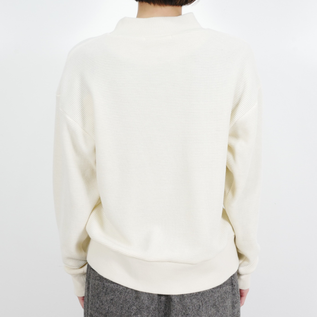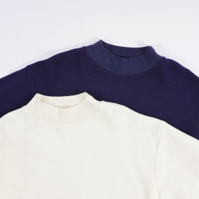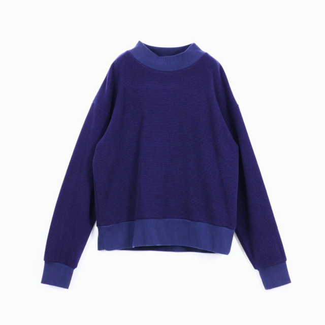 ウール混のふくらみのある糸を使用したワッフル見えのブリスター(ふくれ)ジャガードと、リブを組み合わせたハイネックスウェットデザインのプルオーバーです。