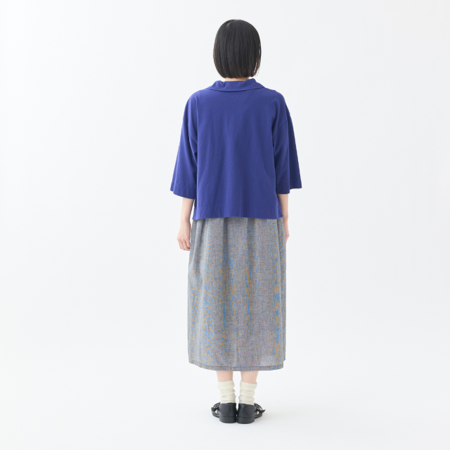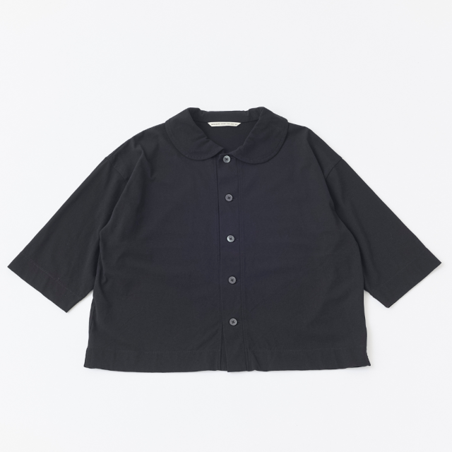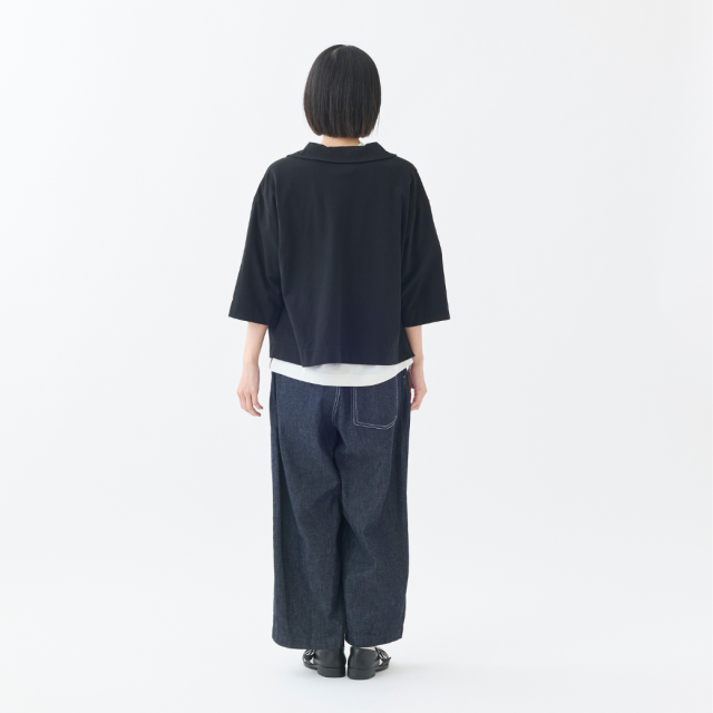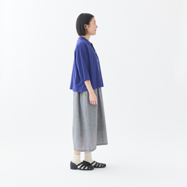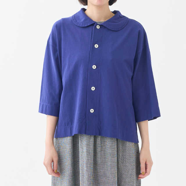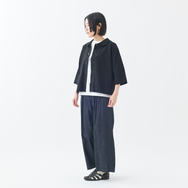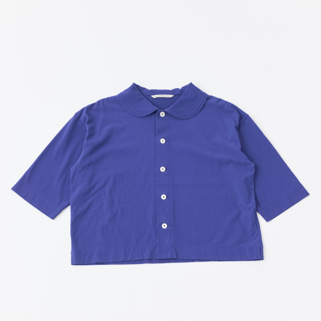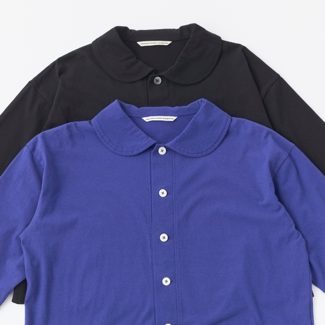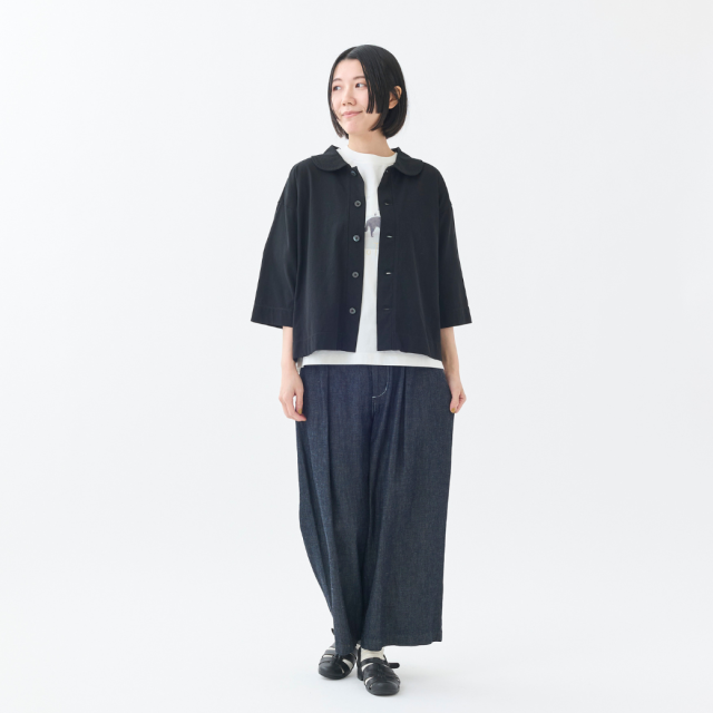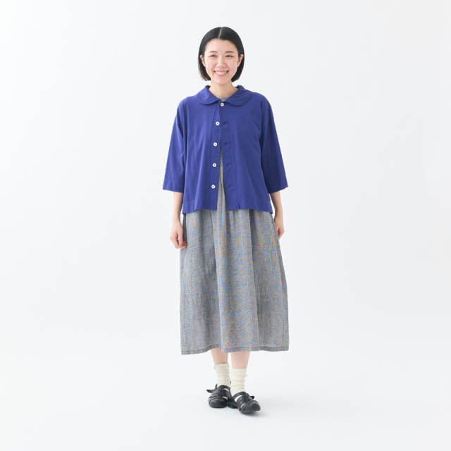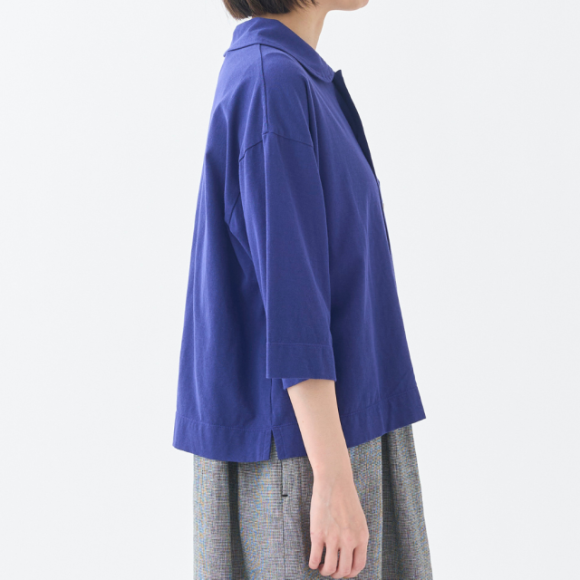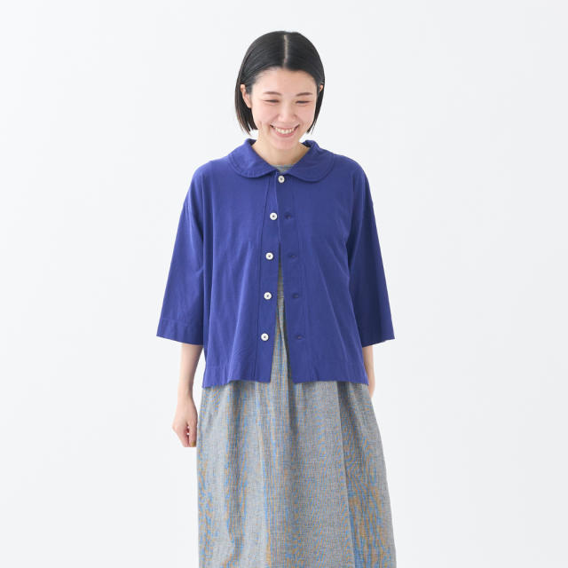 強撚糸をツイルに編むことで程良い立体感を実現し、ナチュラル感とシャリ感を共存させた清涼感のある天竺を使用した丸衿のカーディガン。