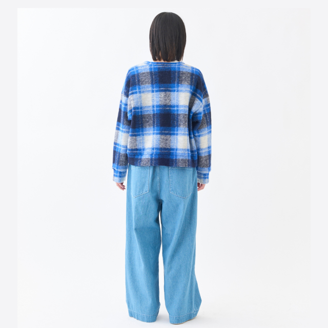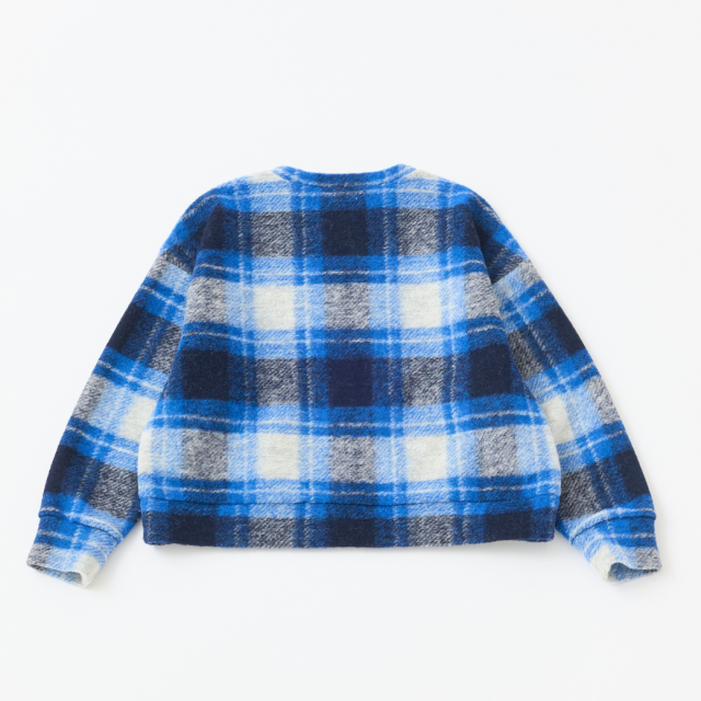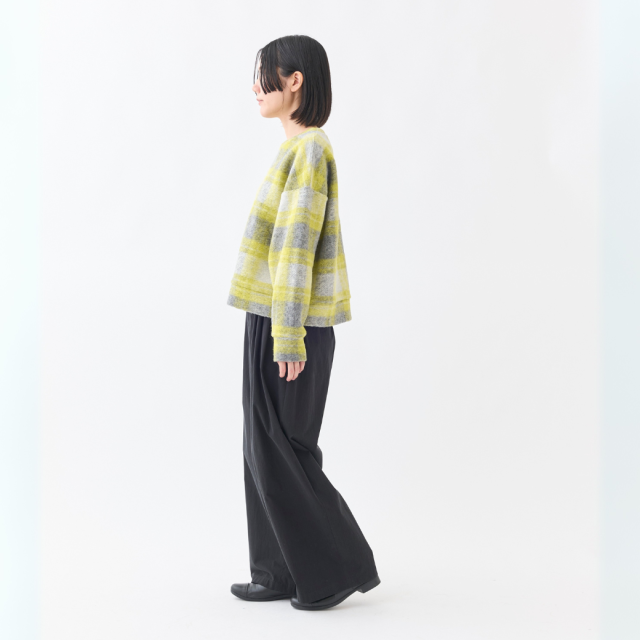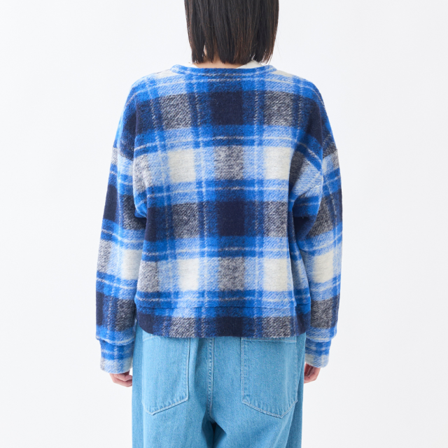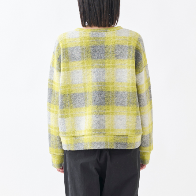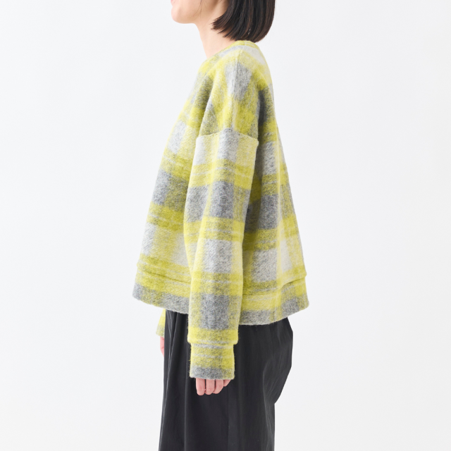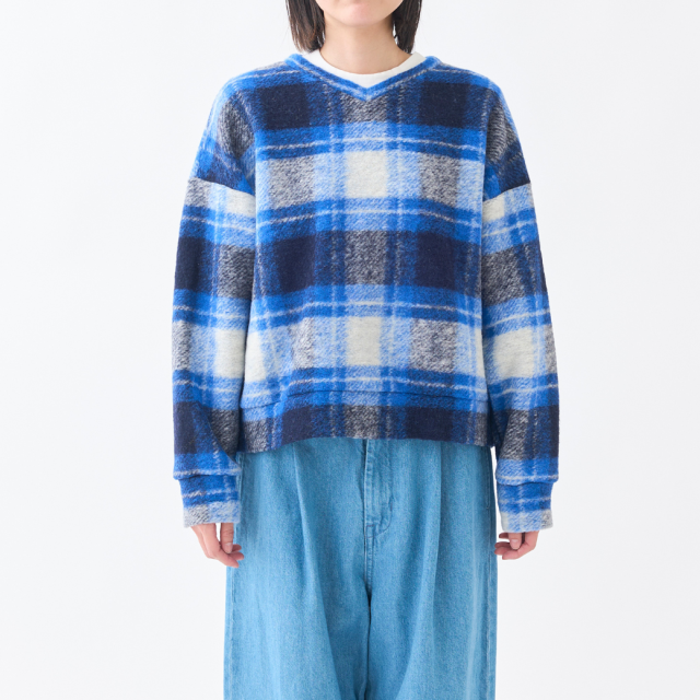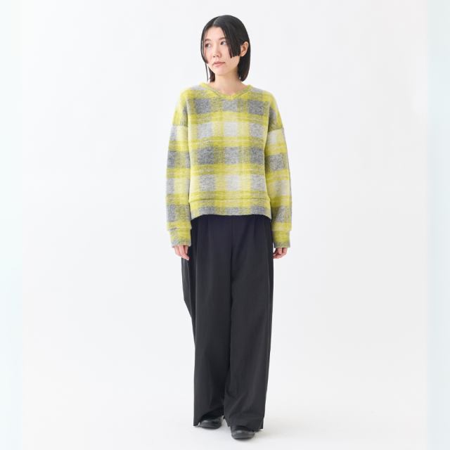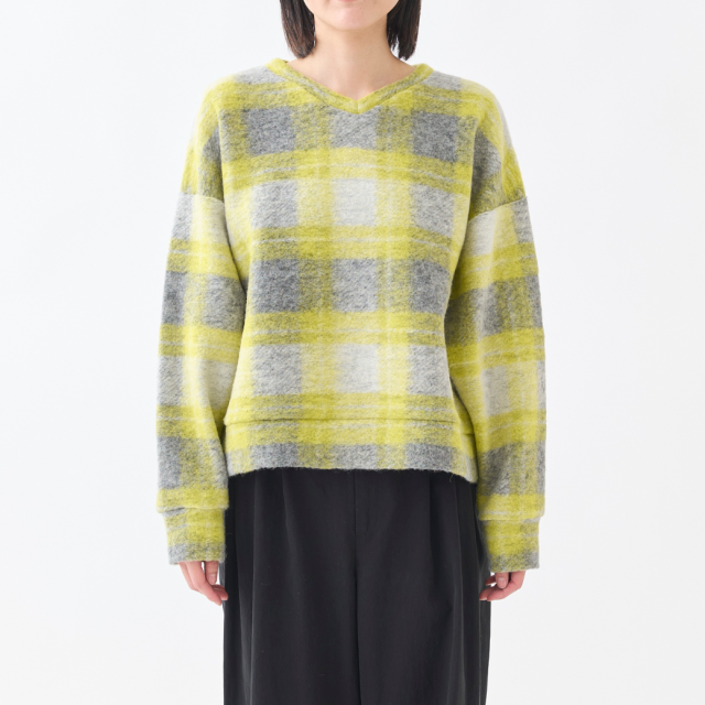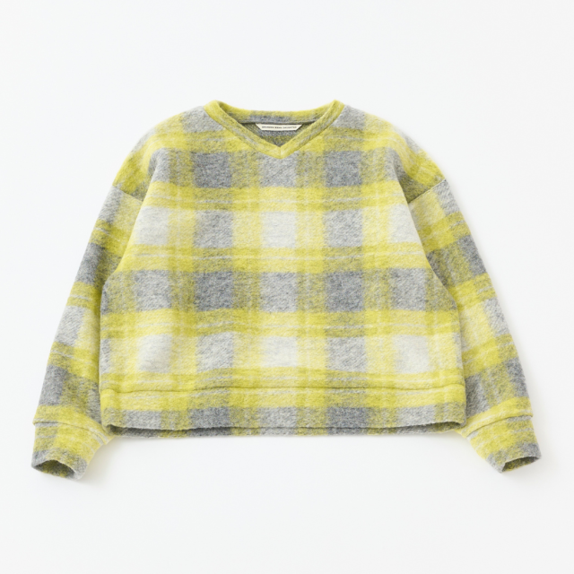 明るいチェックが可愛いVネックプルオーバー。イタリアで特殊な編み機を使用して製造されたジャージー素材は、ウールのワタを撚糸せずに使用することで、軽くてあたたかい生地に仕上がっています。