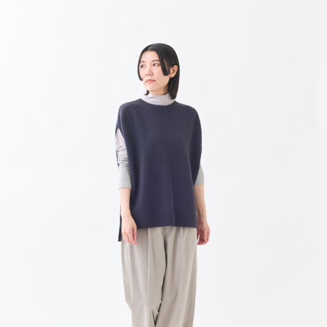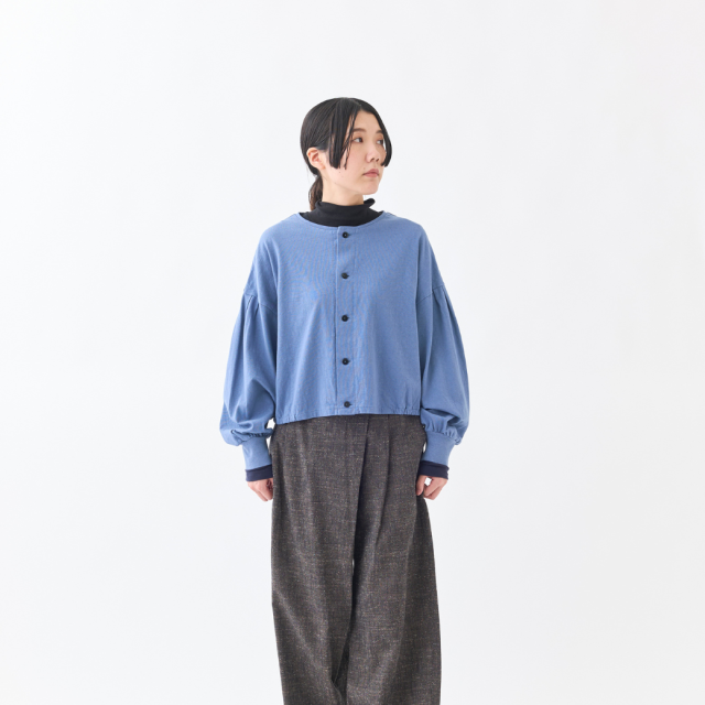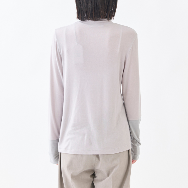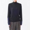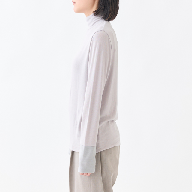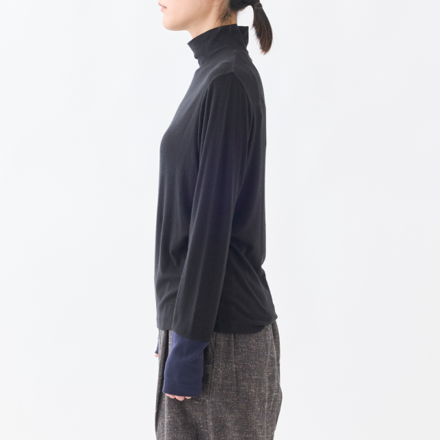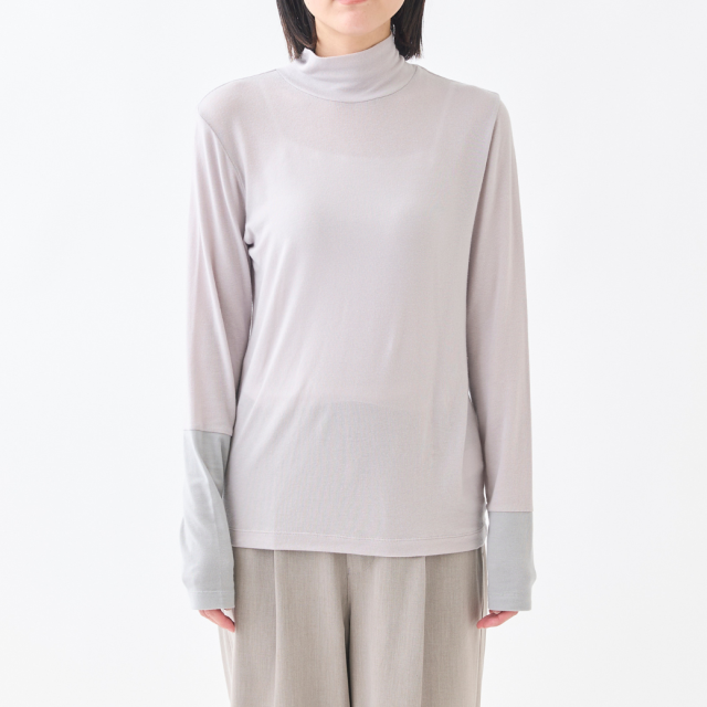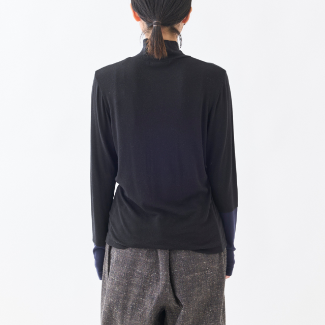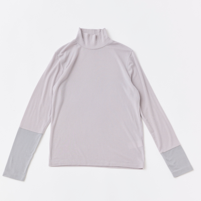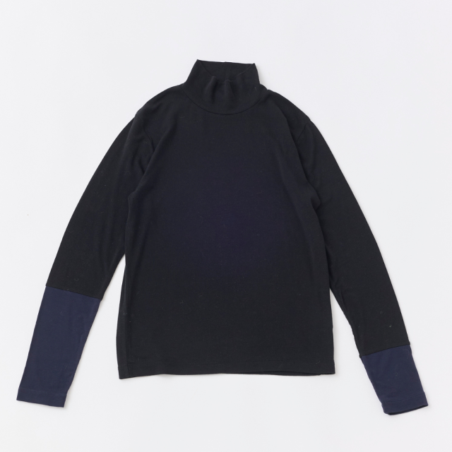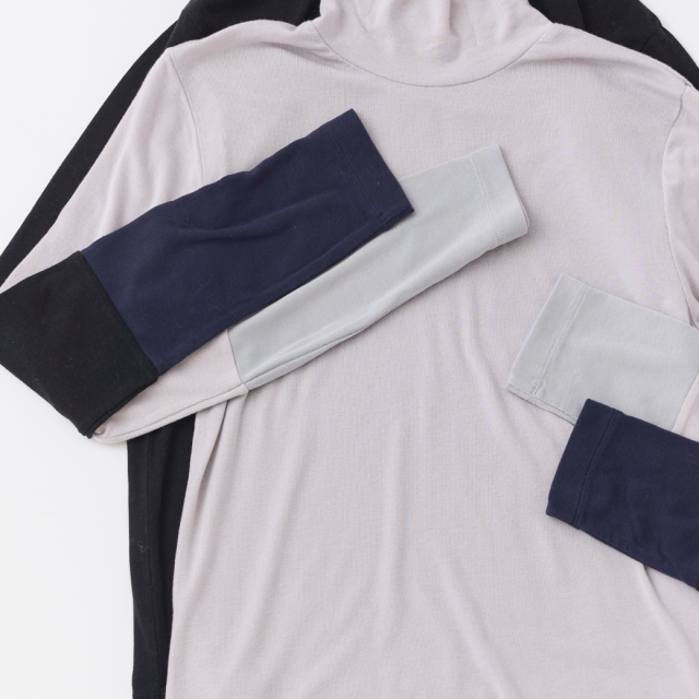 袖口のアシンメトリーな配色切り替えがポイントのハイネックインナーです。薄手ですが透け過ぎず、肌触りが良く、伸縮性がある素材で、とても着心地が良いので、なにかと重宝する1着です。