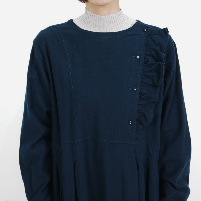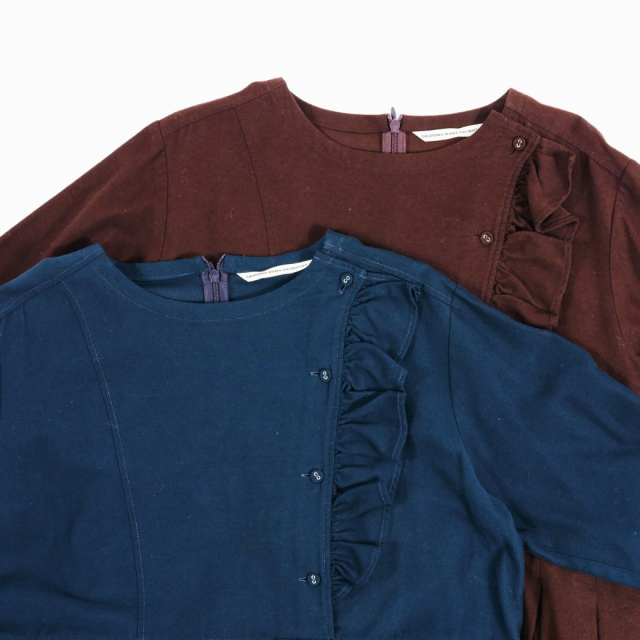 フロントのフリルとくるみ釦がポイントになっており、一枚で上品な印象で着て頂けます。シームポケット付き。