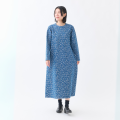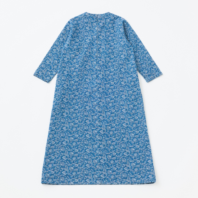 【ORIGINAL FABRIC】【INDIGO】カジュアルにも使いやすい花柄をインディゴジャガードで表現したオリジナル素材『AIHANA』(藍花)のブリーチ加工色の7分袖ワンピースです。