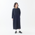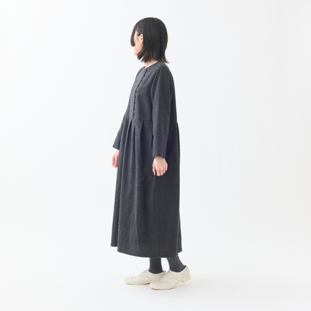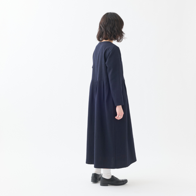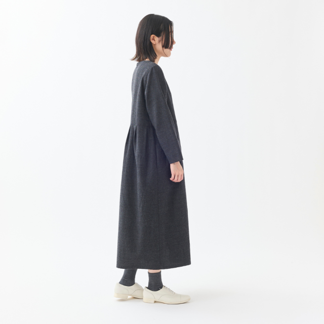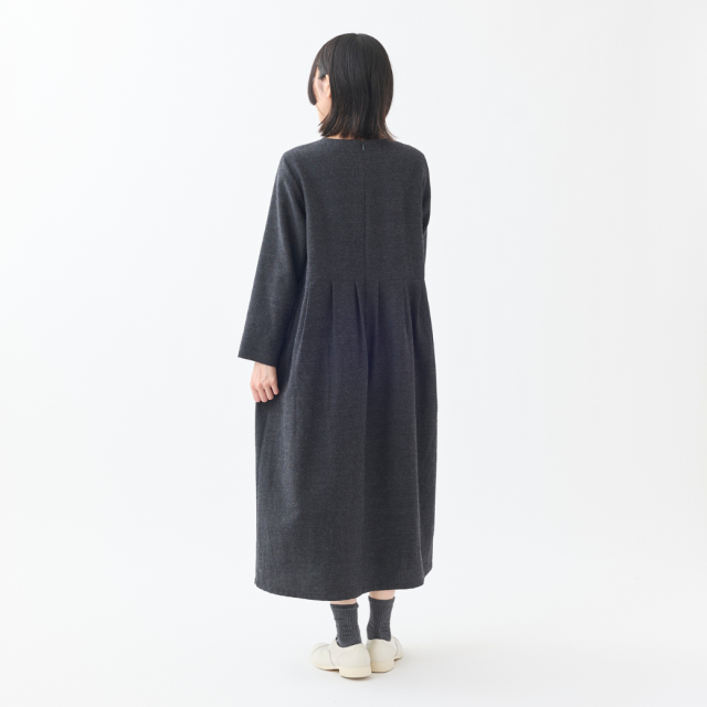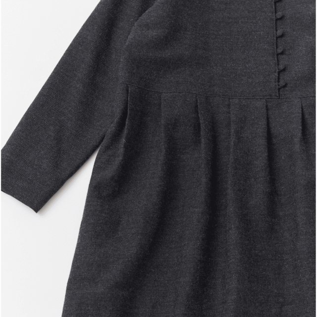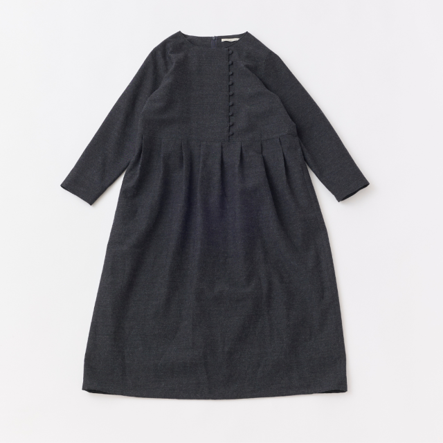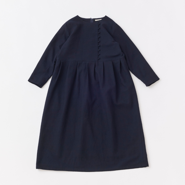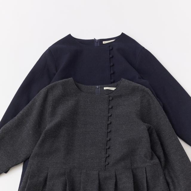 共布くるみボタンがポイントのクルーネックタックワンピース。