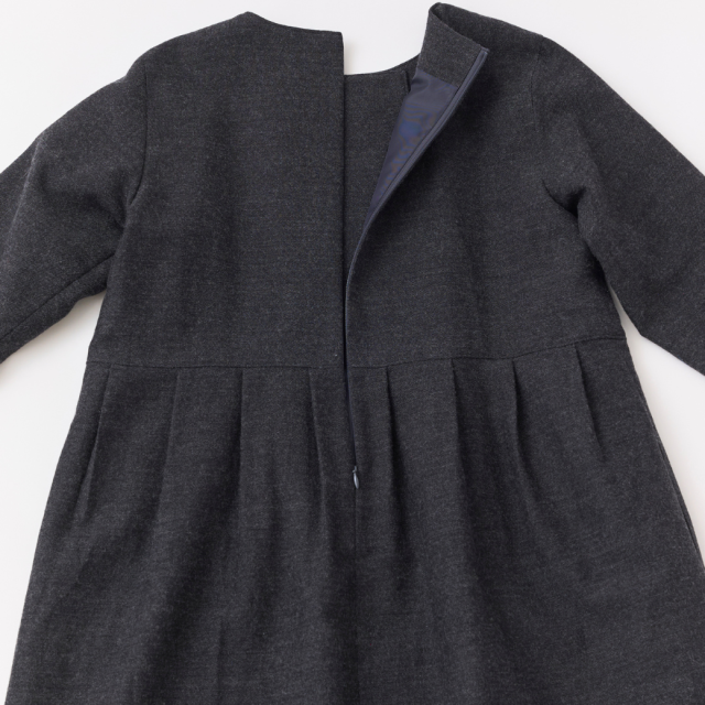 人気のデザインを今回は柔らかな肌触りのコットンと温かみのあるウールを使用し織りあげられたツイル素材で作成しました。後ファスナーあきになっている為、前のボタンは開閉しなくても着用が可能です。