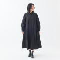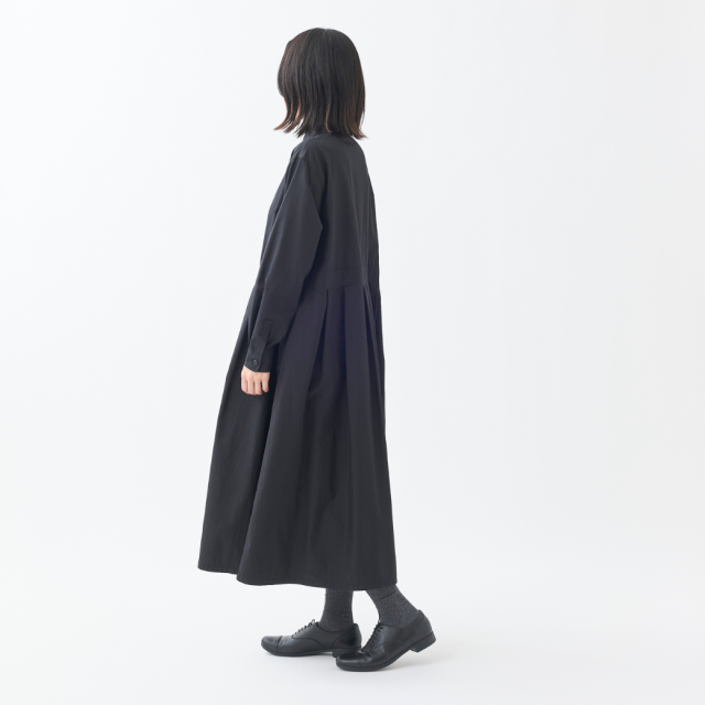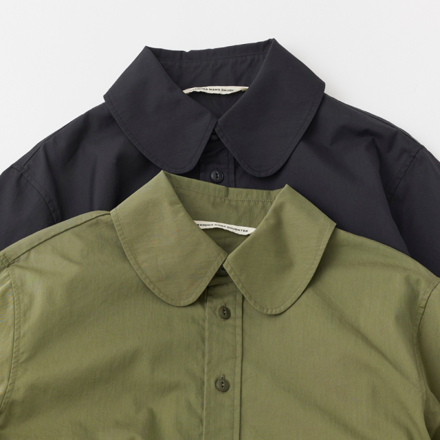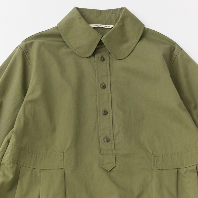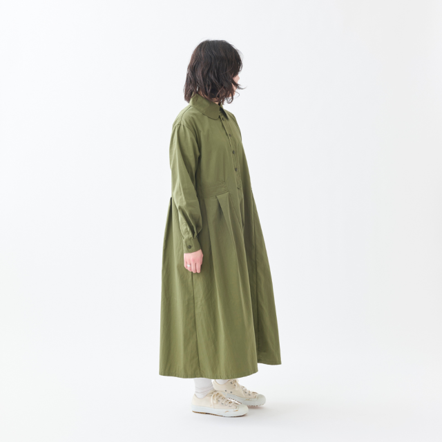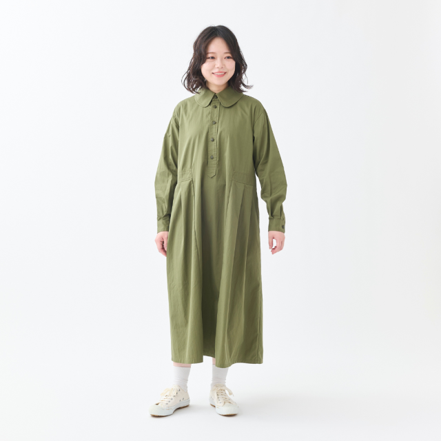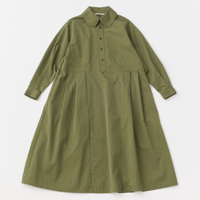光沢感のある表面が特徴で適度なハリのあるコットンナイロンツイル素材を使用している為アーミースタイルを感じさせながら、大きめのラウンドカラーが可愛らしさもあるワンピースです。