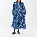 オリジナルデザインの花柄を、インディゴ抜染で表現した綿麻素材を使用したタックワンピース。