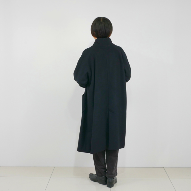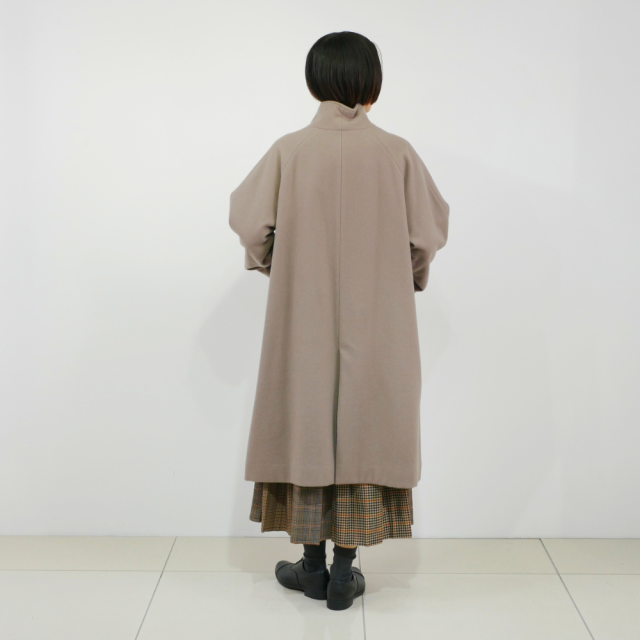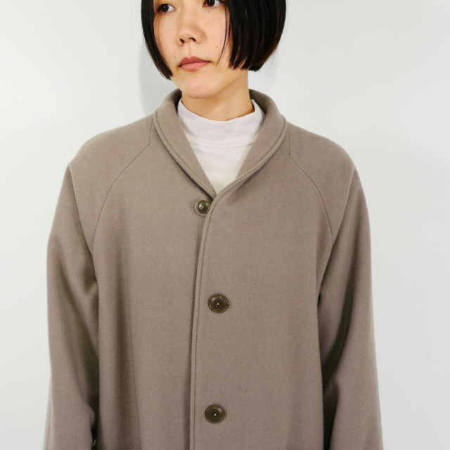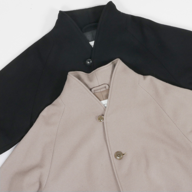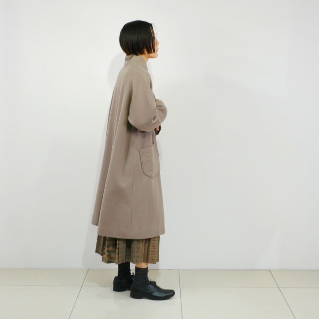 短い衿ですっきりとした首回りが特徴のガウンコート。高級感と保温性がある、軽く、柔らかなビーバー仕上げの素材を使用しています。