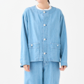 コットンとリネン(麻)を混ぜた糸を使った、6ozの薄手デニム素材のノーカラージャケット。デニムとは思えないほど軽く、やわらかな着心地が特徴です。