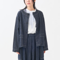 コットンとリネン(麻)を混ぜた糸を使った、6ozの薄手デニム素材のノーカラージャケット。デニムとは思えないほど軽く、やわらかな着心地が特徴です。