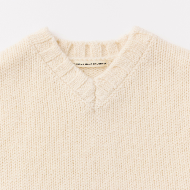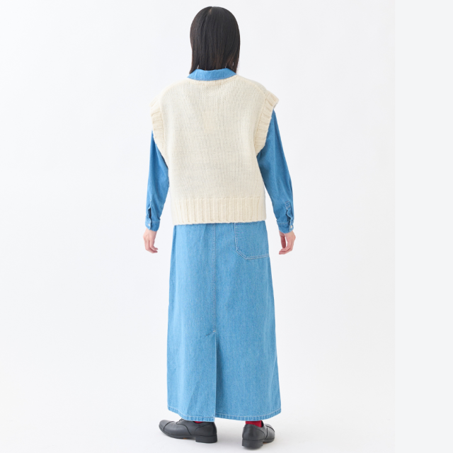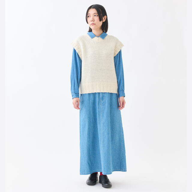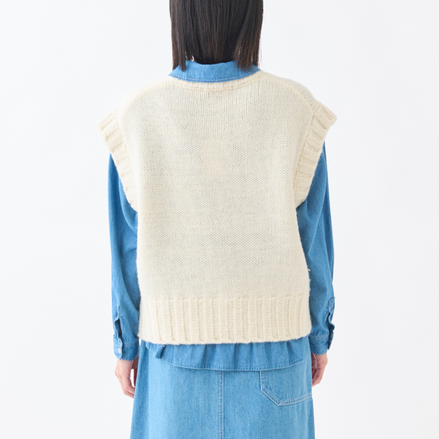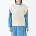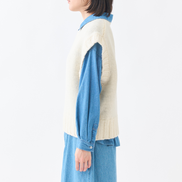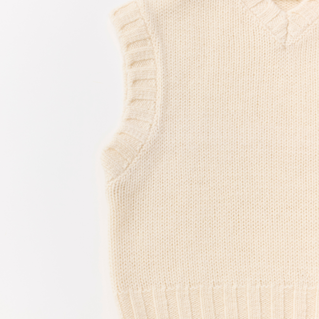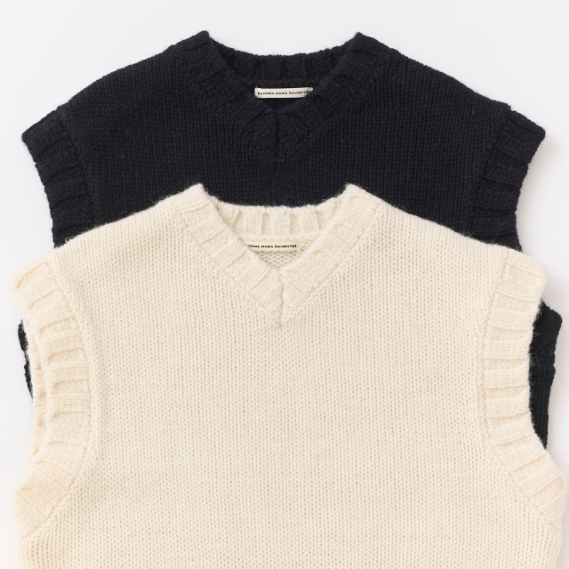 柔らかさと軽さのあるNorway woolの太い糸を使用した、ニットベストです。編地がしっかりと浮き出て、シンプルながらも、衿ぐり・袖ぐり・裾のリブがポイントになった個性的なアイテムです。