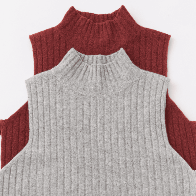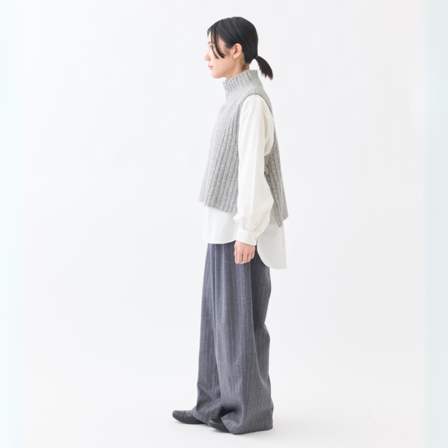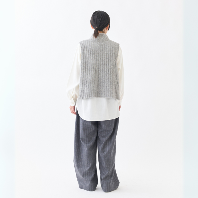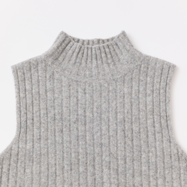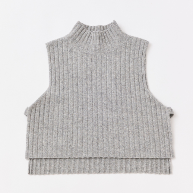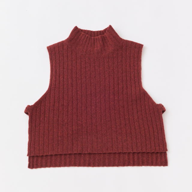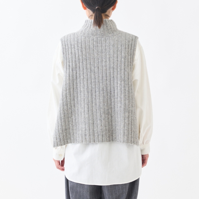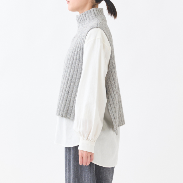 ウール60%、ヤク10%の起毛感のある糸を使用した、タートルニットベスト。ショート丈で脇が開いている仕様の為、シャツやワンピースに重ねてもバランスのとりやすいデザインになっています。