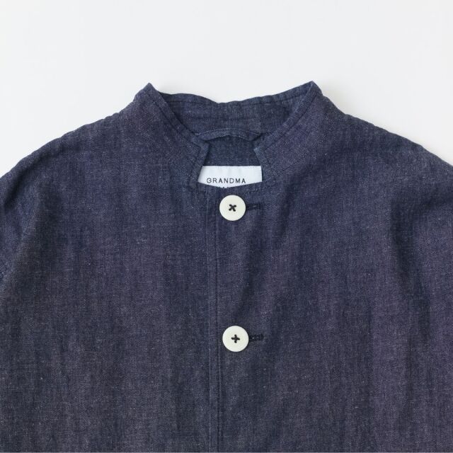 前中心には衿がなく、首元がすっきり見えるスタンドカラーが特徴的で、フラップポケットや、大きめのボタンもポイントです。