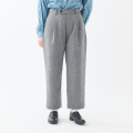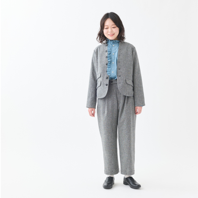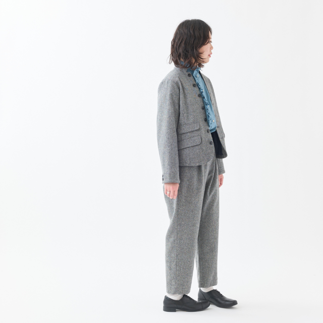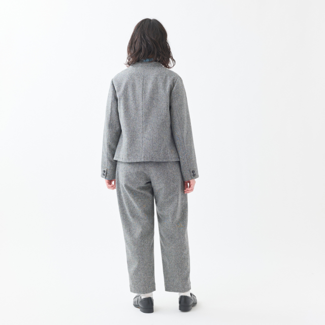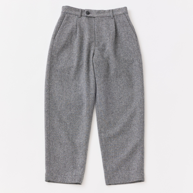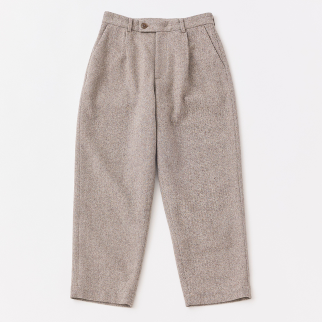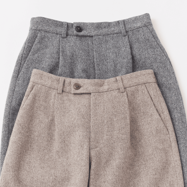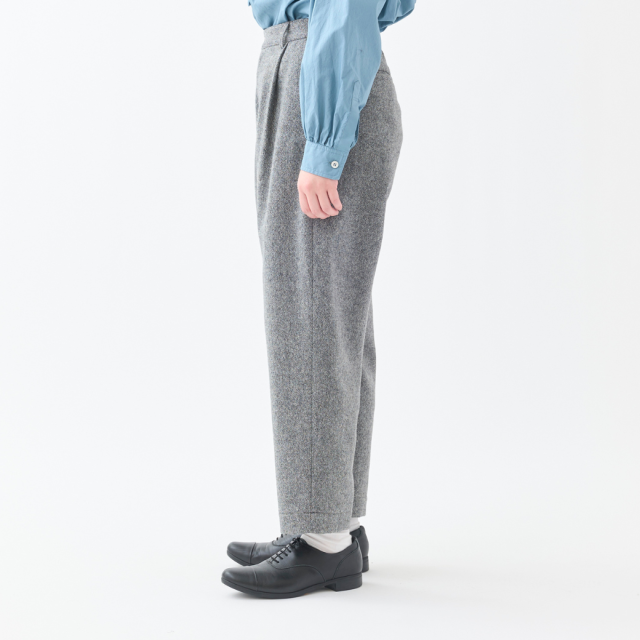 タテ糸に薄い色、ヨコ糸に濃色を配して織る柄が猫の足跡に見えるホームスパンツイード素材を使用したフロントタック入りのテーパードパンツ。ヒップ・もも周りはゆとりがあり、裾にかけてテーパードがかかっています。