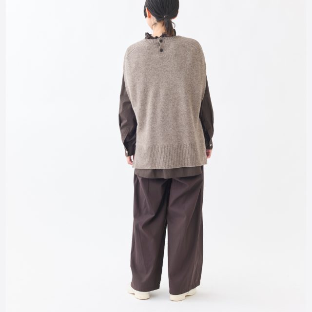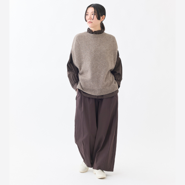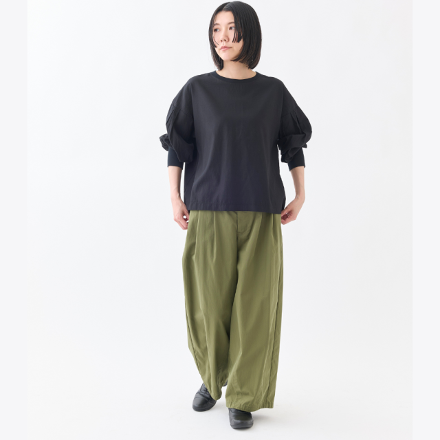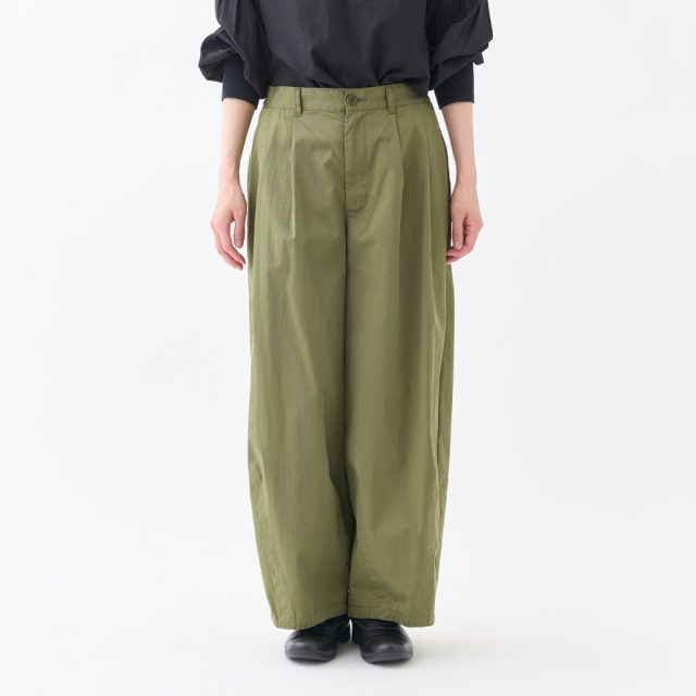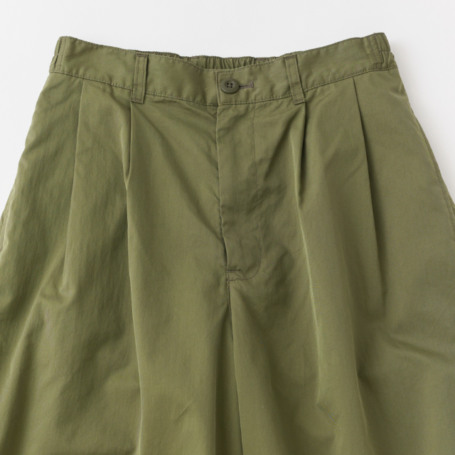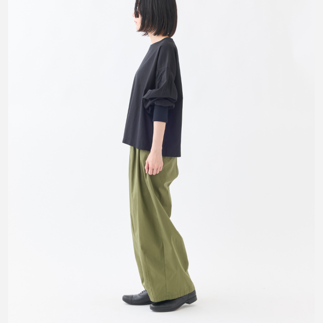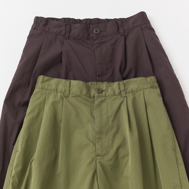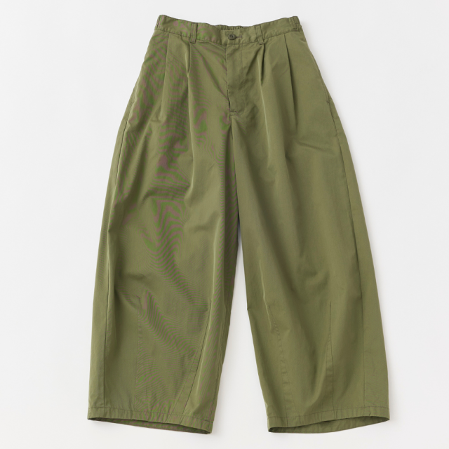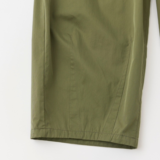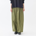 光沢感のある表面が特徴で適度なハリのあるコットンナイロンツイル素材をカジュアルなバルーンパンツに仕立てました後ベルトはゴムが通っており、リラックス感のある履き心地で、通年お使い頂ける素材感です。
