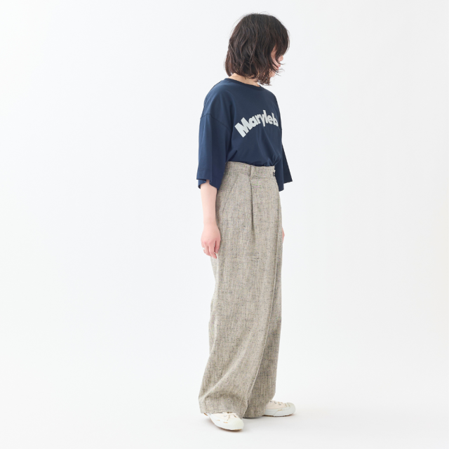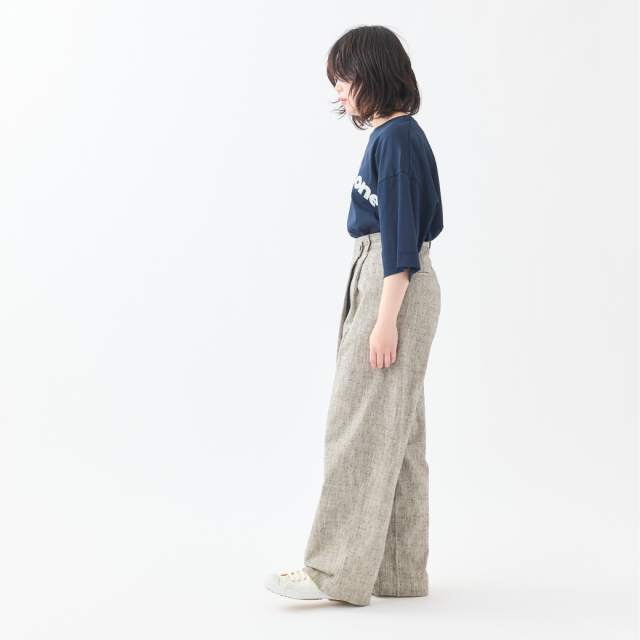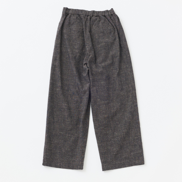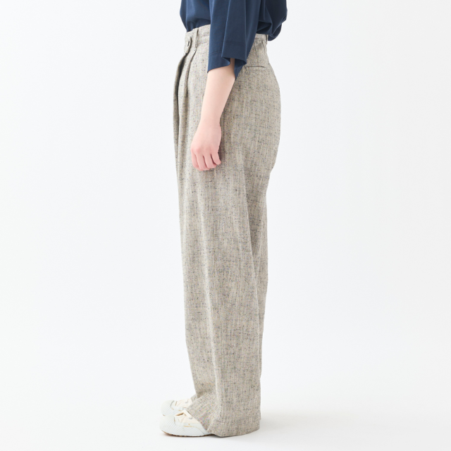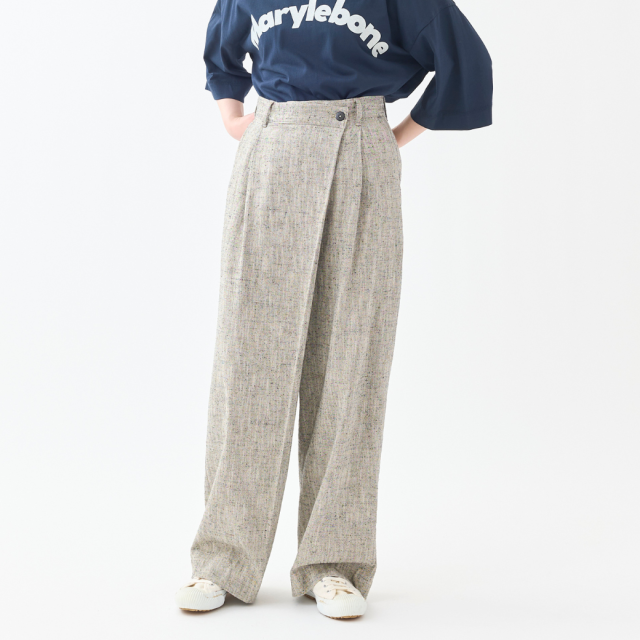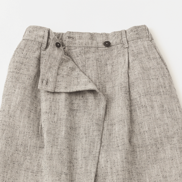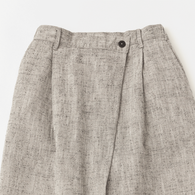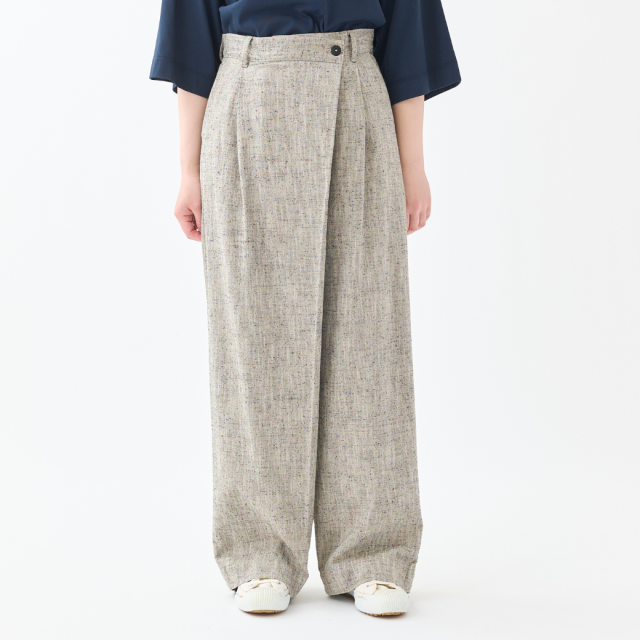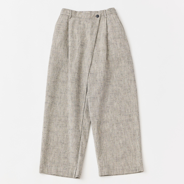 コットンシルクのスラブが適度に表面に現れハンドクラフトのようなざっくり感が特徴的なネップツイード素材を使用したラップ風デザインのワイドパンツです。
