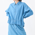 緩やかに脇から後が長くなったヘムラインで、裾付近のゴムギャザーによって生まれるゆるいフリル形状が優しい雰囲気のデザインです。