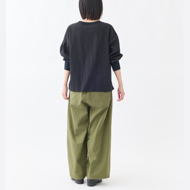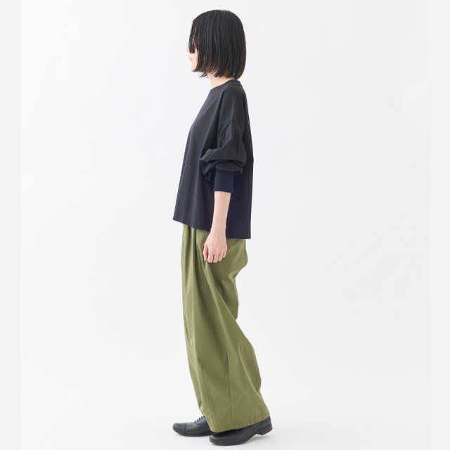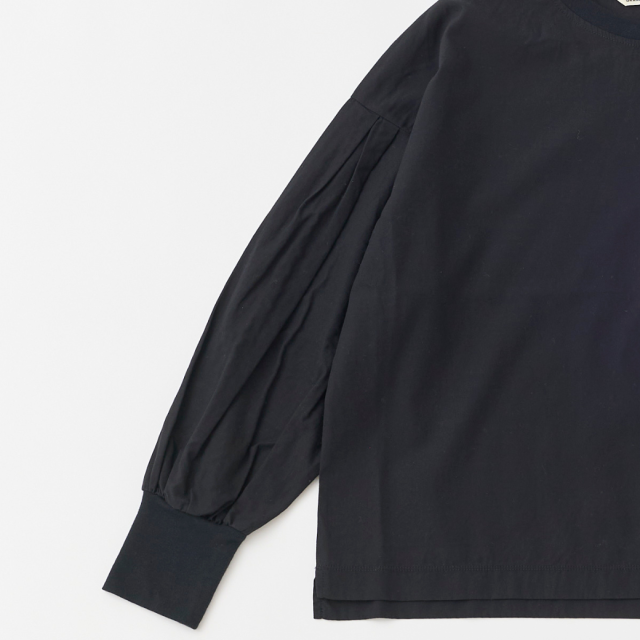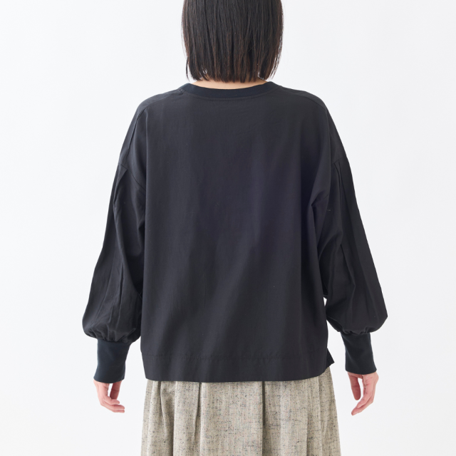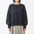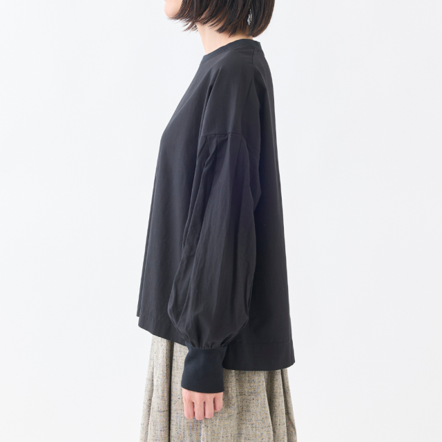 ネックと袖口をリブで切り替えたボリュームスリーブシャツです。糸に羽毛とふくらみを持たせるフィブリル加工によるソフトな肌ざわりと、適度なハリが特徴の薄手のブロード素材を使用し、1枚着としても、ジャケットやベスト、ジャンスカのインナーにも使いやすいトップスです。