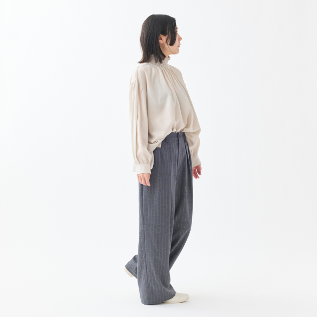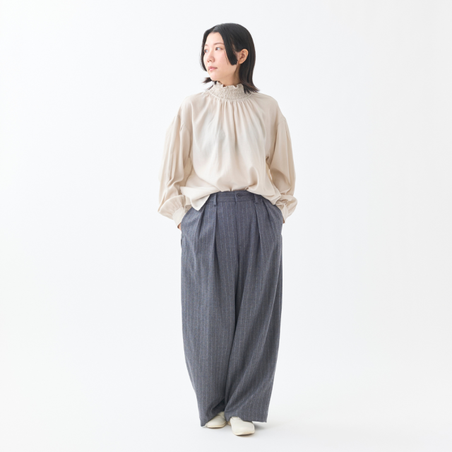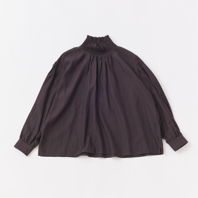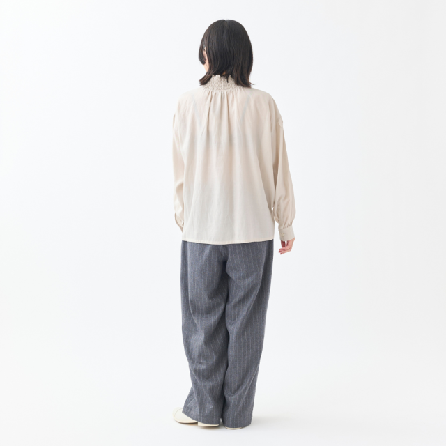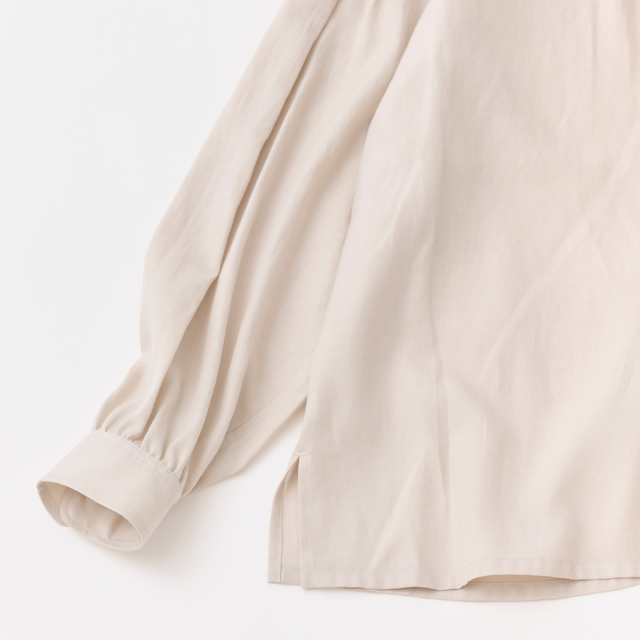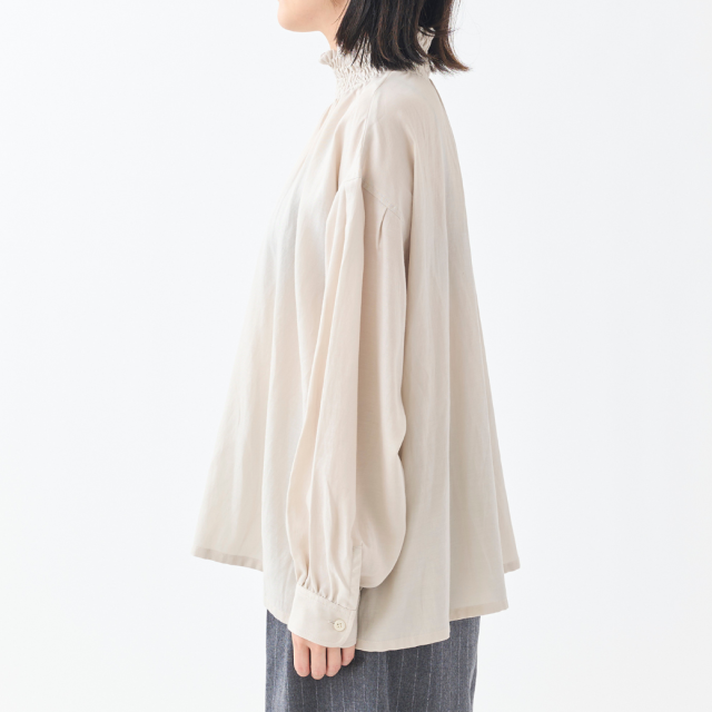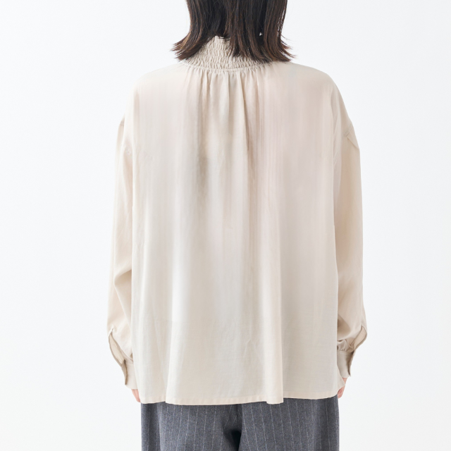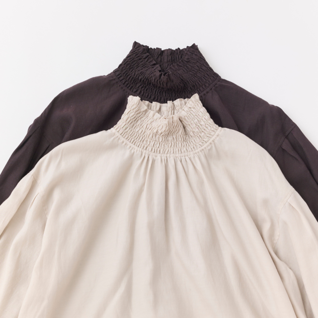 タテ糸にキュプラ、ヨコ糸に綿を使用し、光沢がありながらナチュラル感がある素材です。1cm間隔に5本シャーリングゴムでギャザーを寄せたハイネックのブラウスです。