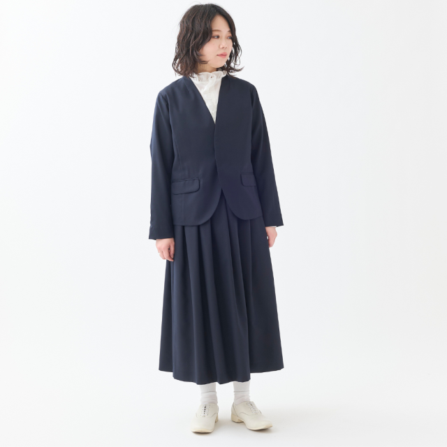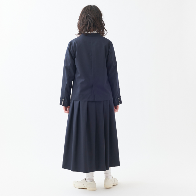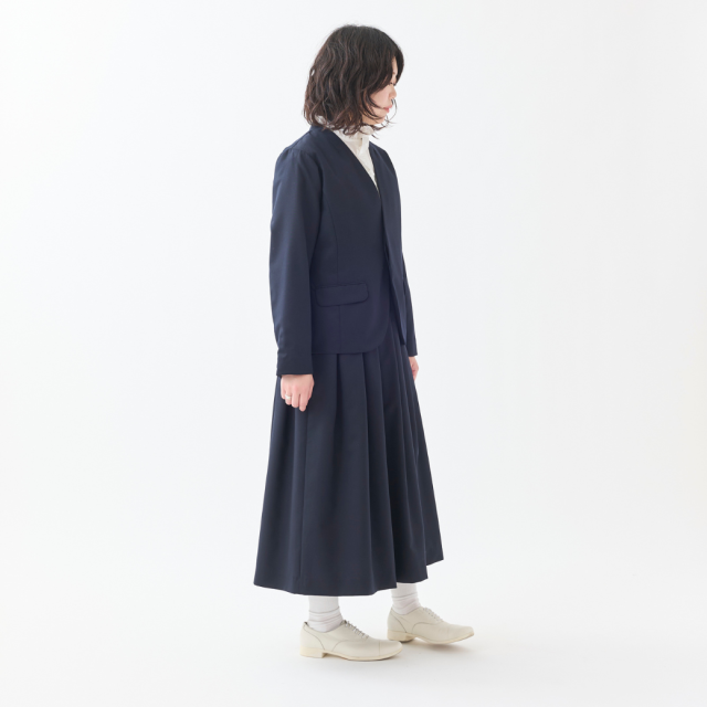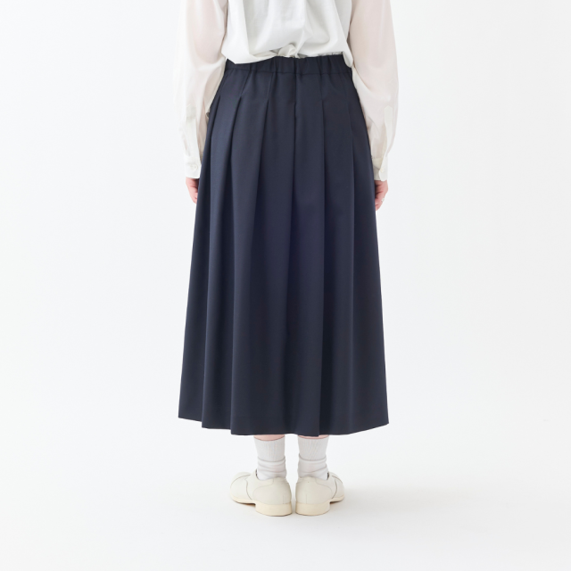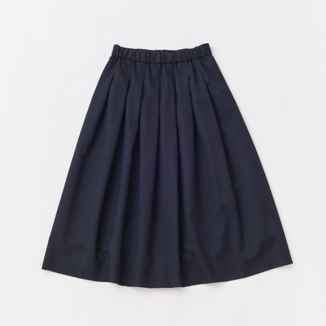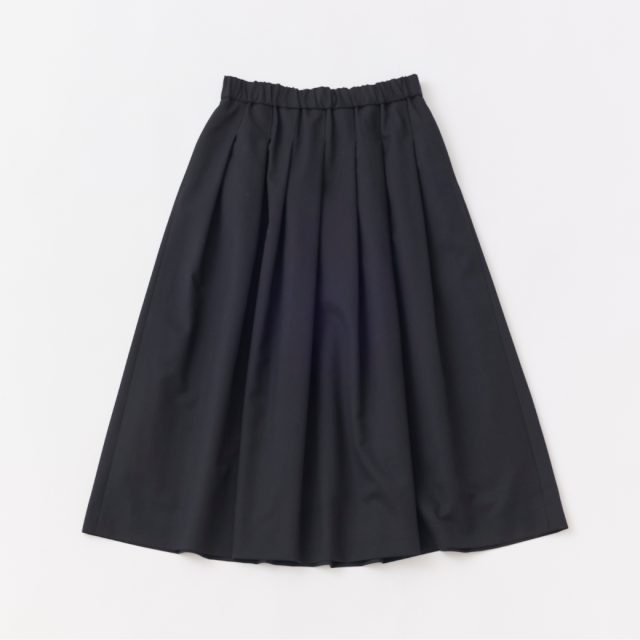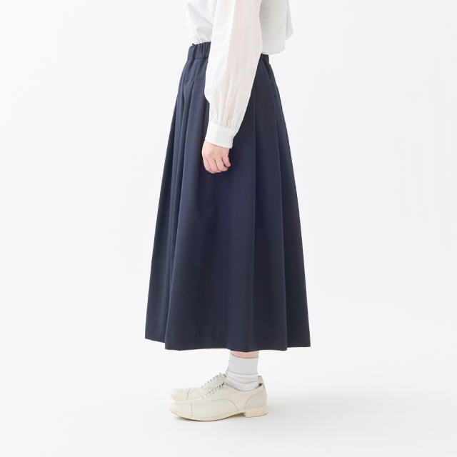 しなやかなドレープ性、柔らかく膨らみのある風合いのSUPER100'Sウール原料のギャバジン素材を使用したワンウェイ(一方向)タックのロングスカートです。