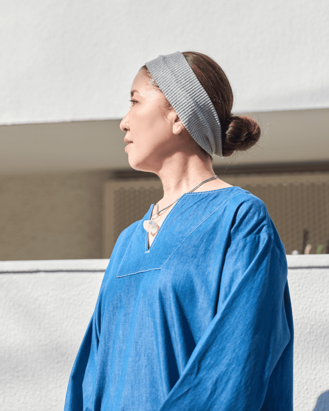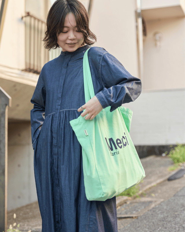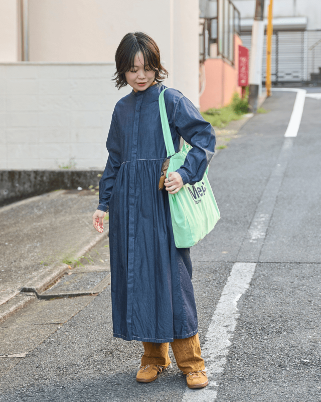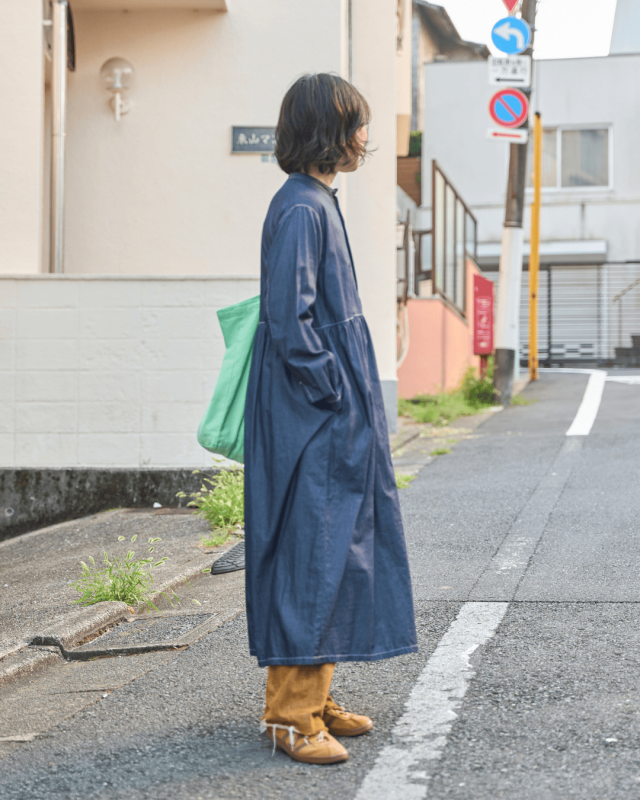 4ozデニム バンドカラーギャザーワンピース(INDIGO)