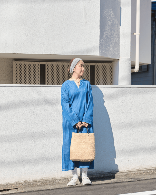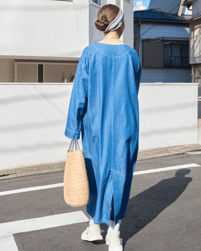 6.5ozデニム キーネックスモックワンピース(LIGHT INDIGO)