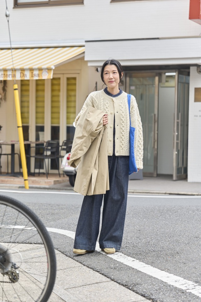 ベージュ系でまとめてデニムが