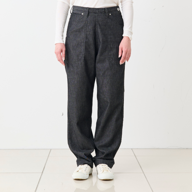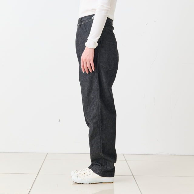 女性向けワークパンツをルーツに持つランチパンツから着想を得た、深い股上とサイドジップが特徴の定番デニムをブラック仕様で展開。